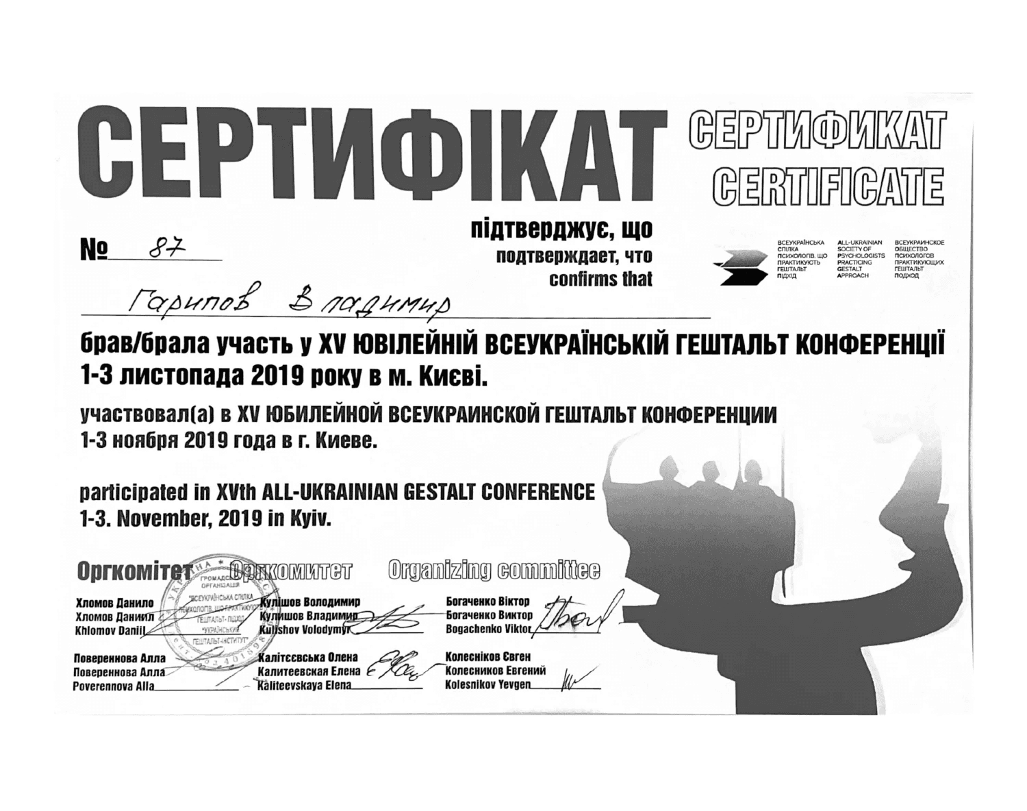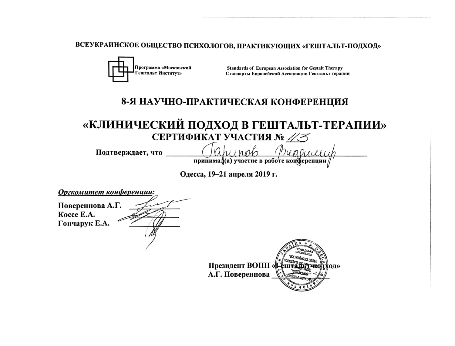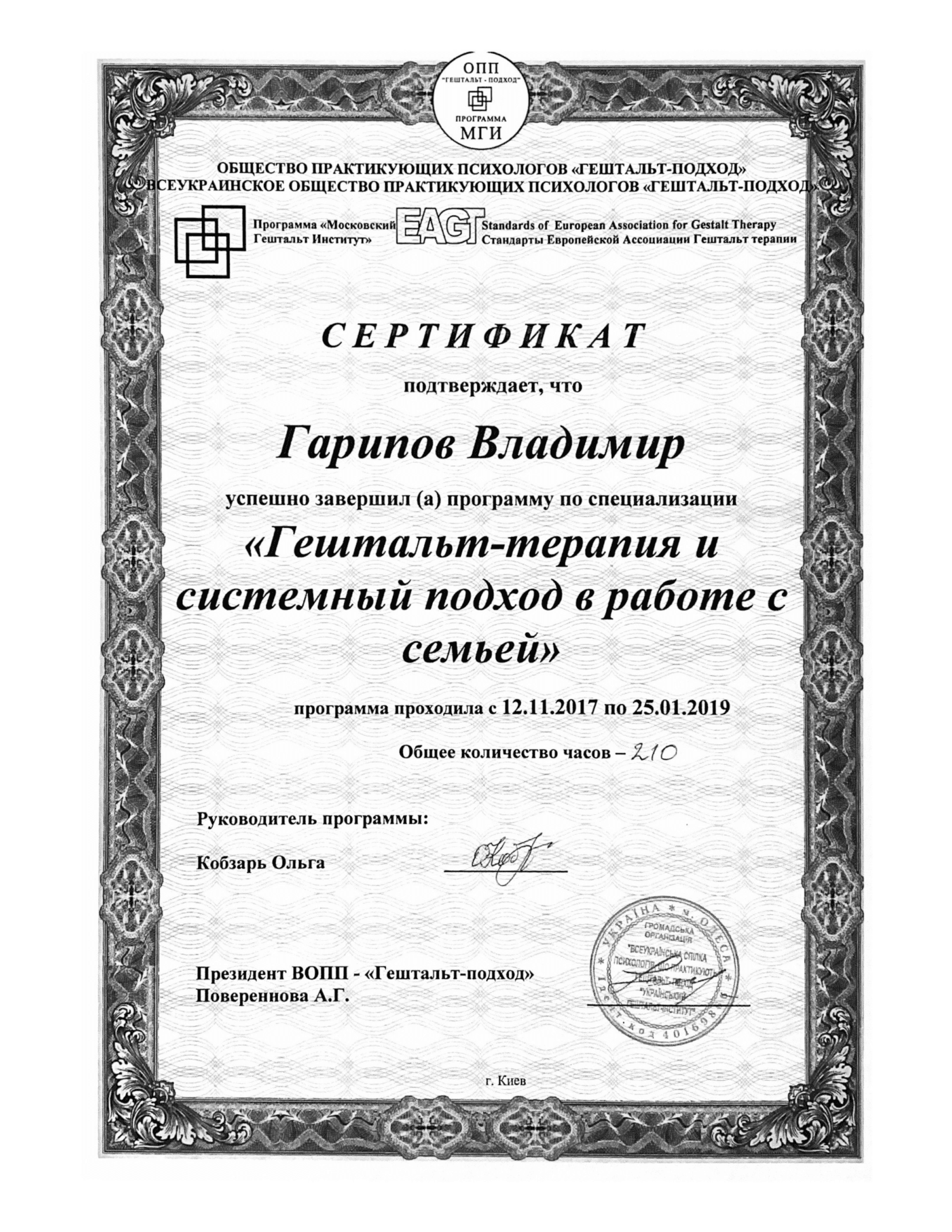- Спеціалізація "Сімейні системи в гештальт-терапії" – ГО НАГТУ "Український гештальт інститут".