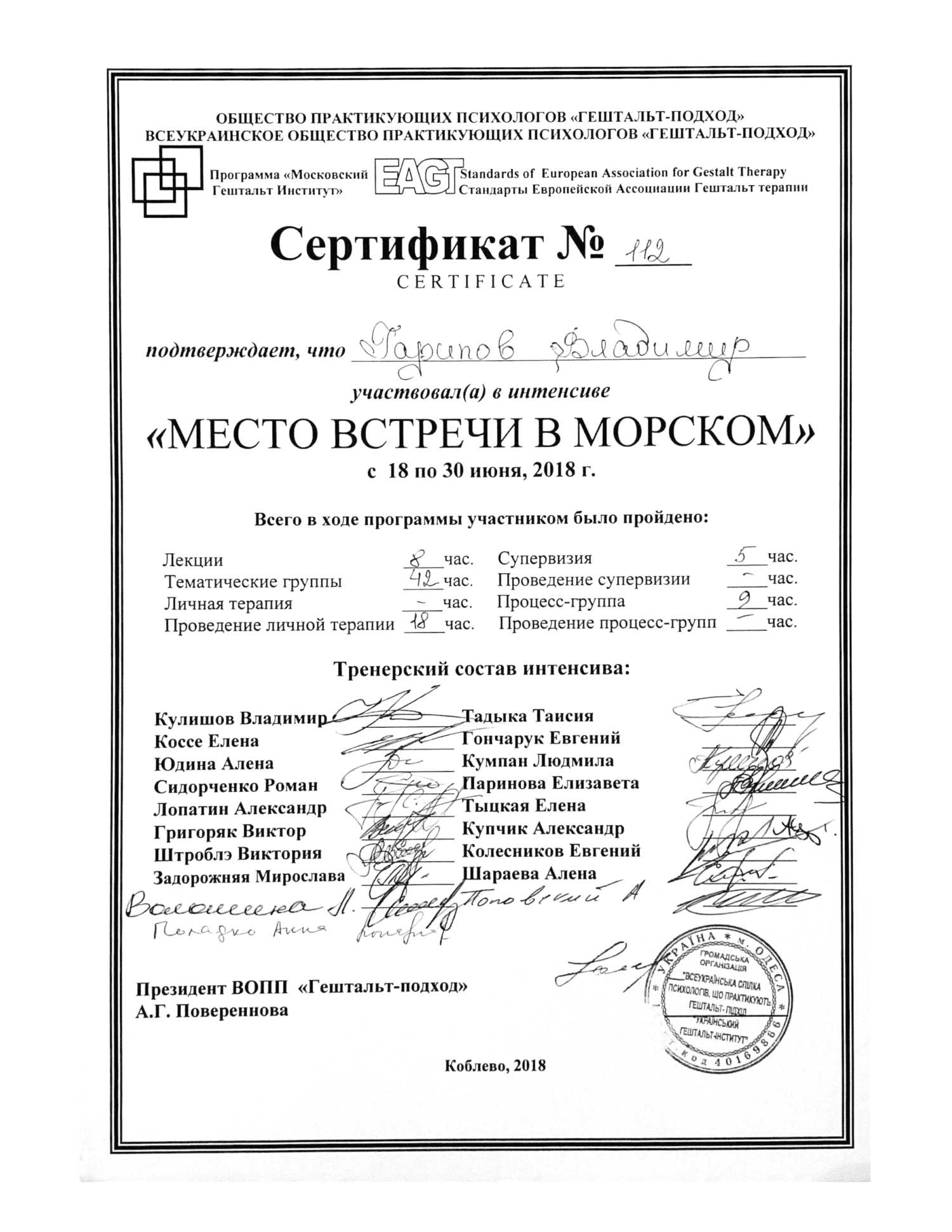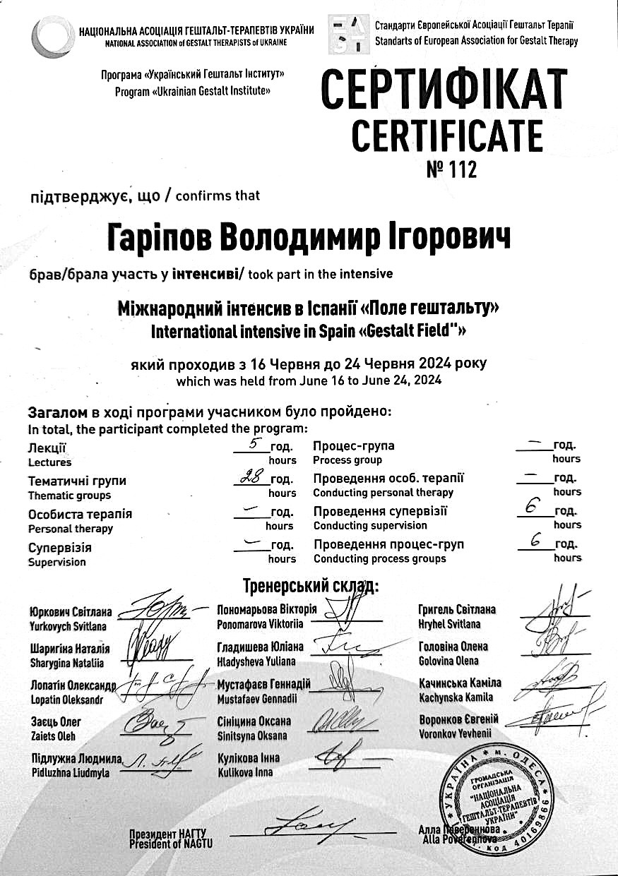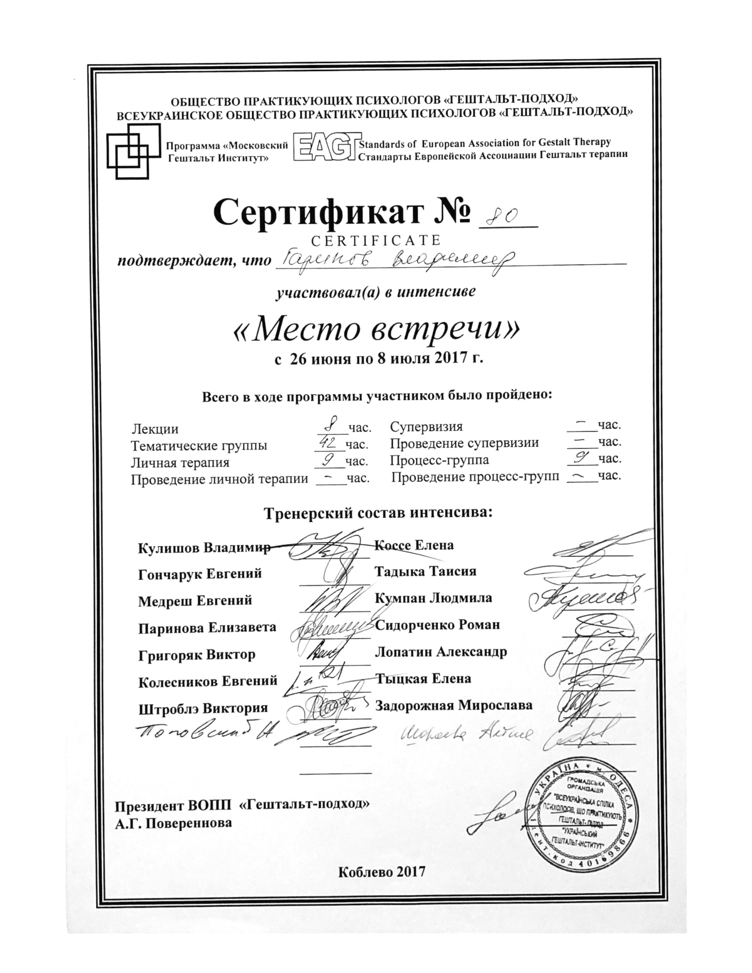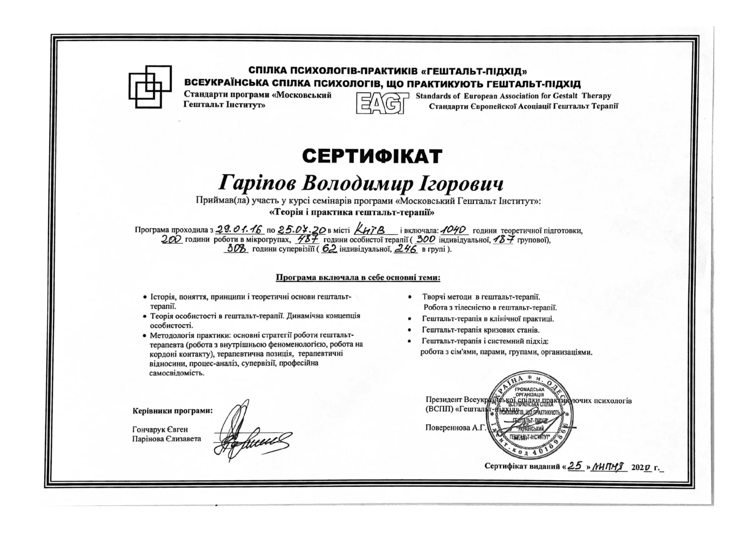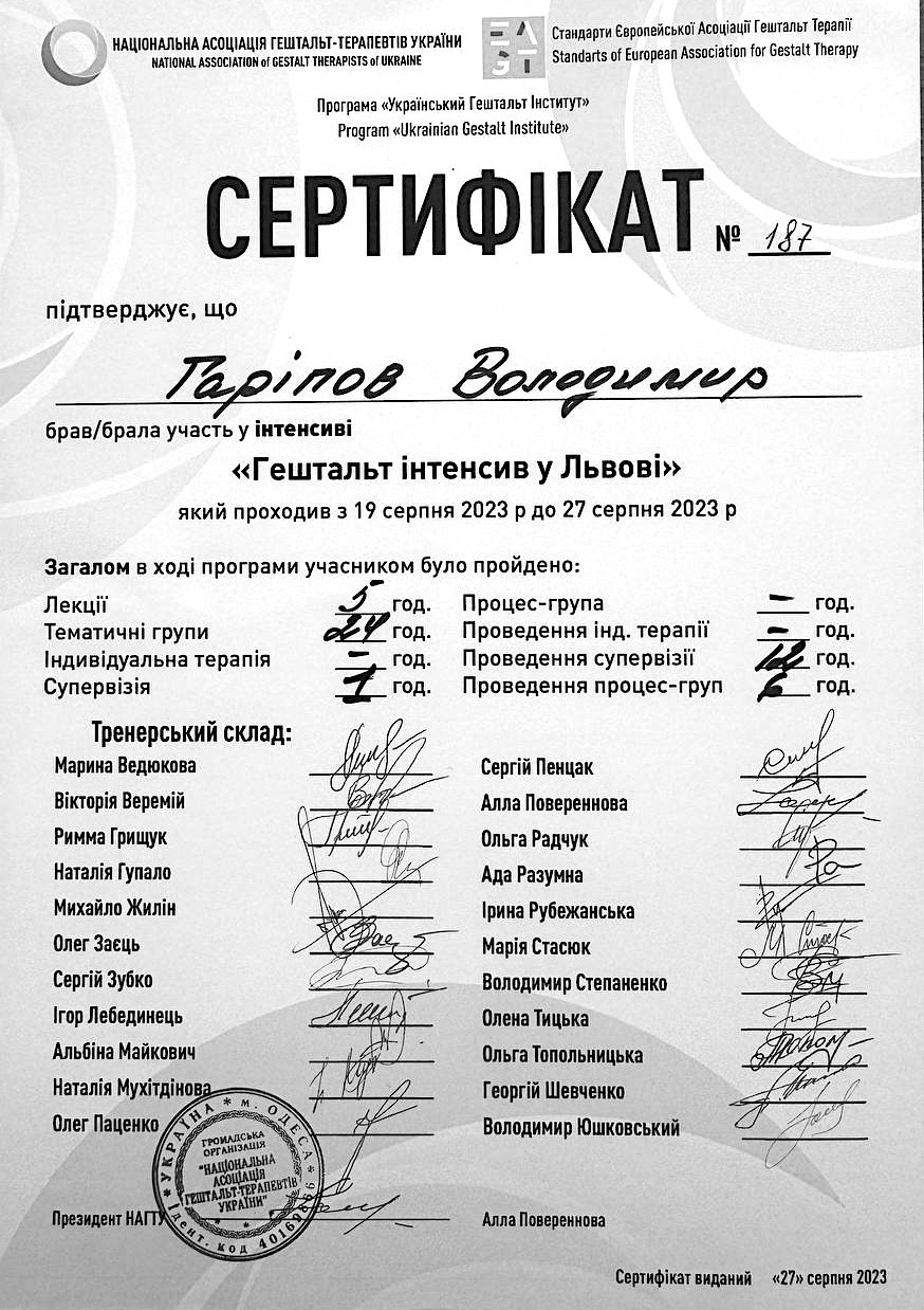 - І та ІІ ступінь - Гештальт-терапія – в ГО НАГТУ "Український гештальт інститут".