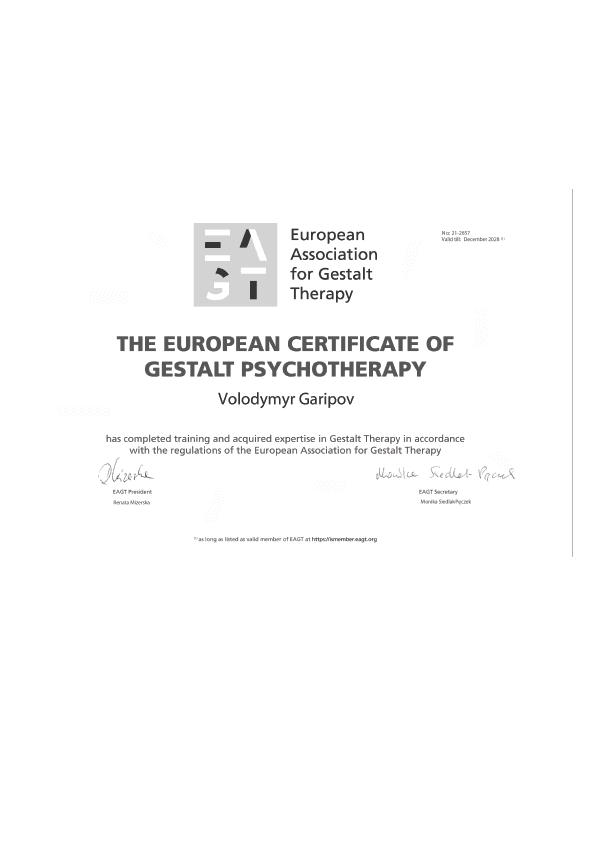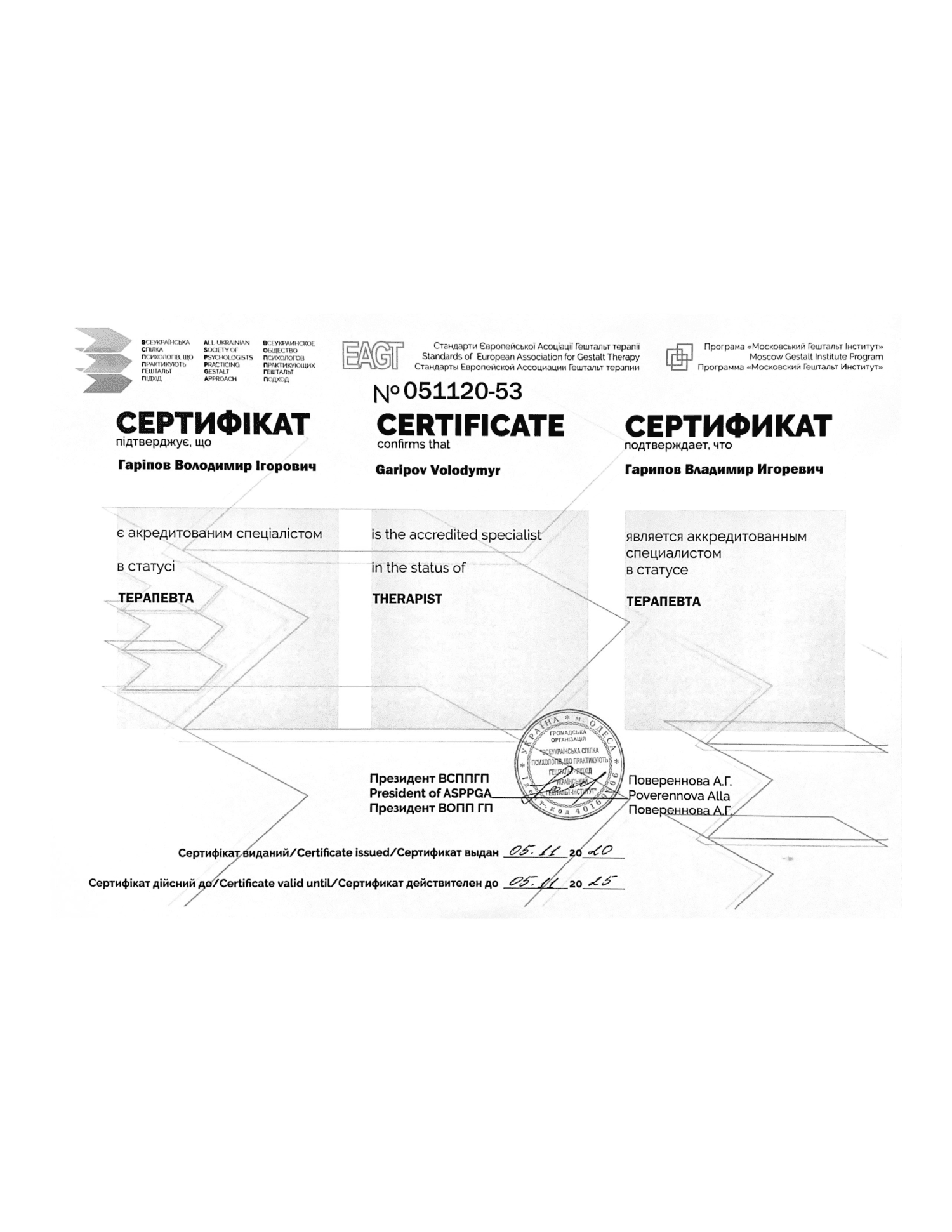 - Акредитований гештальт-терапевт – European Association for Gestalt Therapy (EAGT) та Національна Асоціація Гештальт-Терапевтів України (НАГТУ).