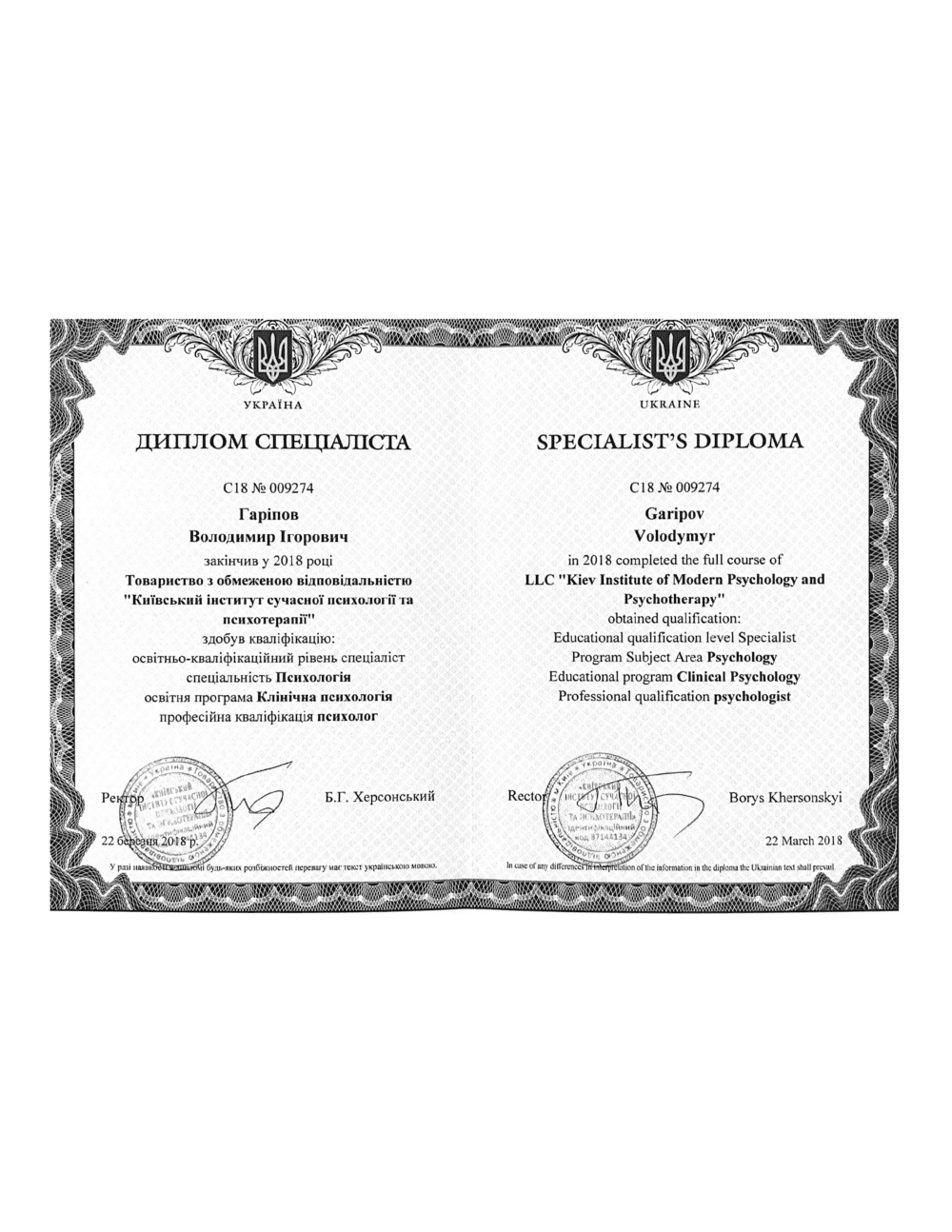 - Ступінь з клінічної психології – Київський Інститут Сучасної Психології та Психотерапії. Диплом № C18№009274.