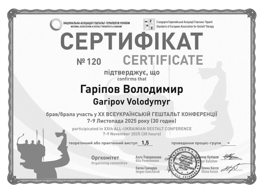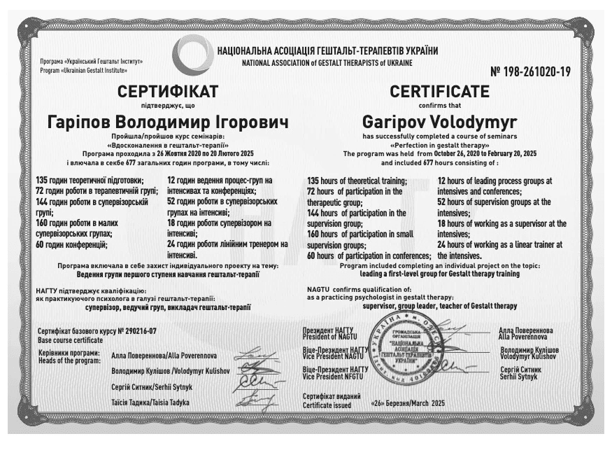 - ІІІ ступінь - Гештальт-терапія – в ГО НАГТУ "Український гештальт інститут".