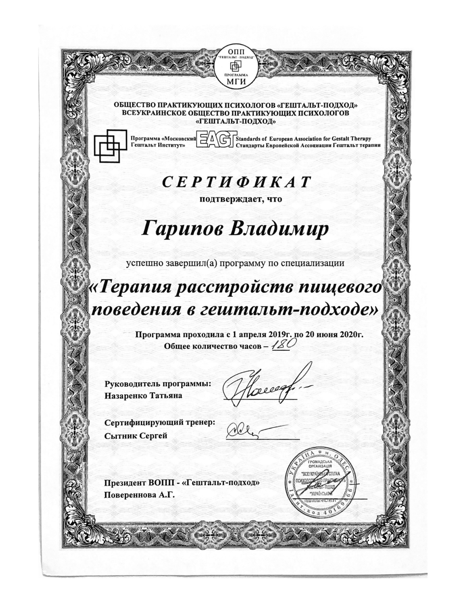 - Спеціалізація "Робота з розладами харчової поведінки в гештальт-терапії" – ГО НАГТУ "Український гештальт інститут".