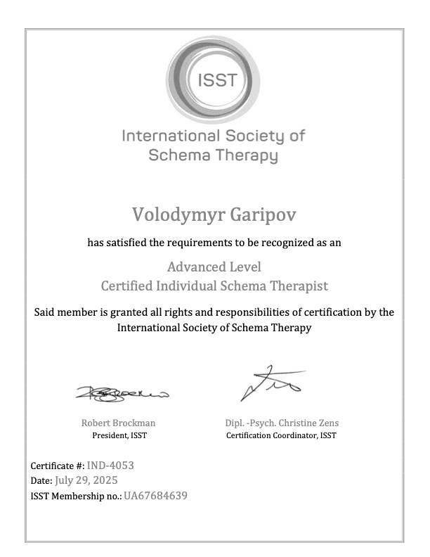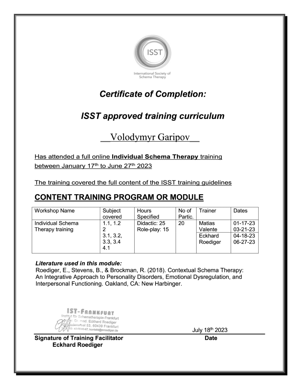 - Схема-терапія – навчання в International Society of Schema Therapy (Bad Vilbel, Germany), акредитований терапевт ISST. Сертифікат № IND-3342