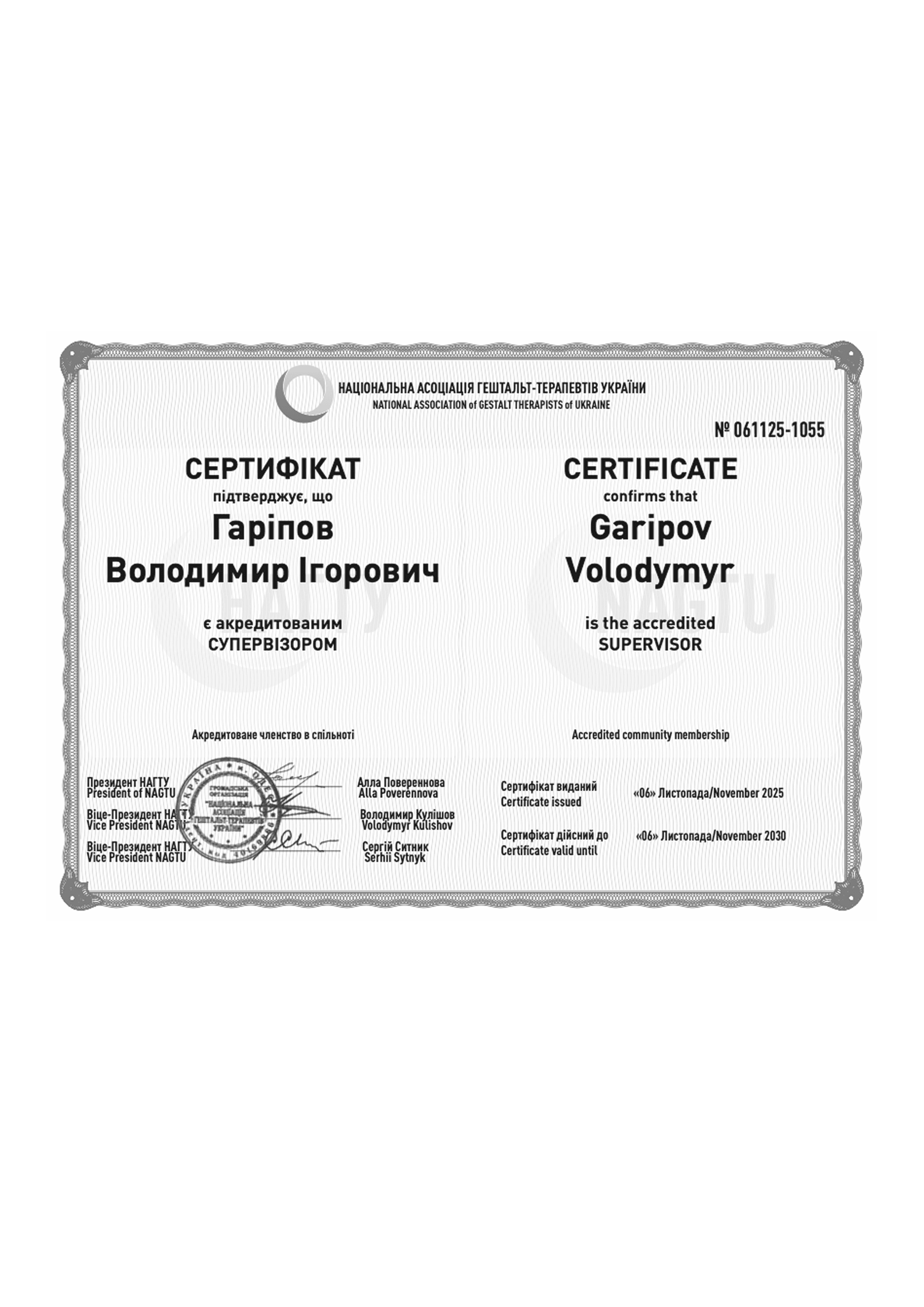 - Акредитований супервізор НАГТУ – Національна Асоціація Гештальт-Терапевтів України.
