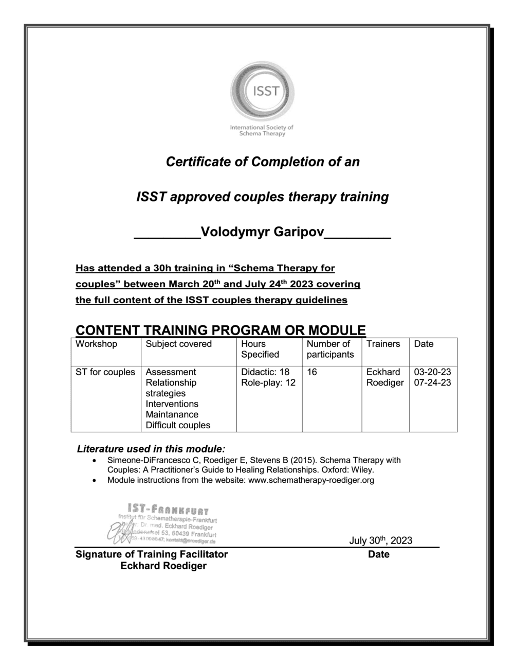 - Спеціалізація "Робота з парами в схемотерапії" – International Society of Schema Therapy (ISST).